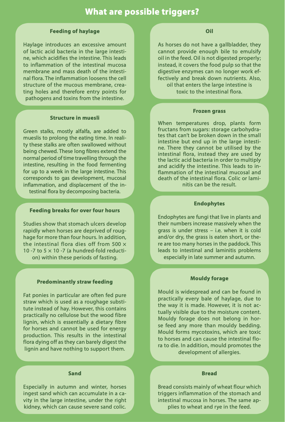 The horse's intestine is a complex ecosystem that reacts very sensitively to disturbances. The introduction of foreign germs, changes in pH value, or changes in the speed at which the food pulp passes through the intestine quickly lead to sensitive intestinal disorders.